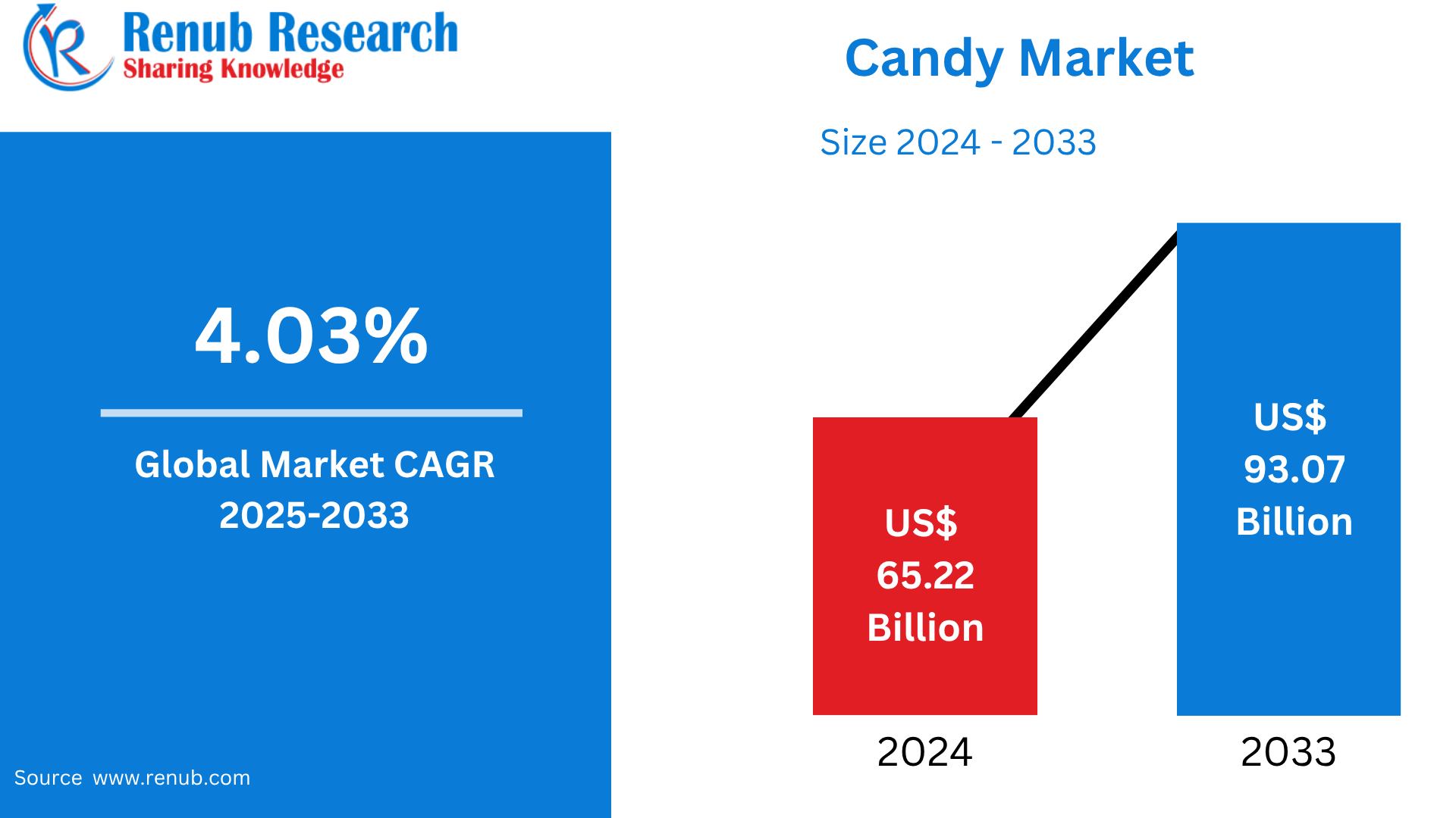 According to Renub Research Global Candy Market is poised to experience substantial expansion over the next decade, increasing from USD 65.22 billion in 2024 to USD 93.07 billion by 2033, at a CAGR of 4.03%. Market growth is being fueled by rising consumer indulgence, product innovation, expanding middle-class purchasing power, premiumization trends, and increasing demand for health-conscious candy varieties such as sugar-free, low-calorie, organic, vegan, and fortified confectionery.