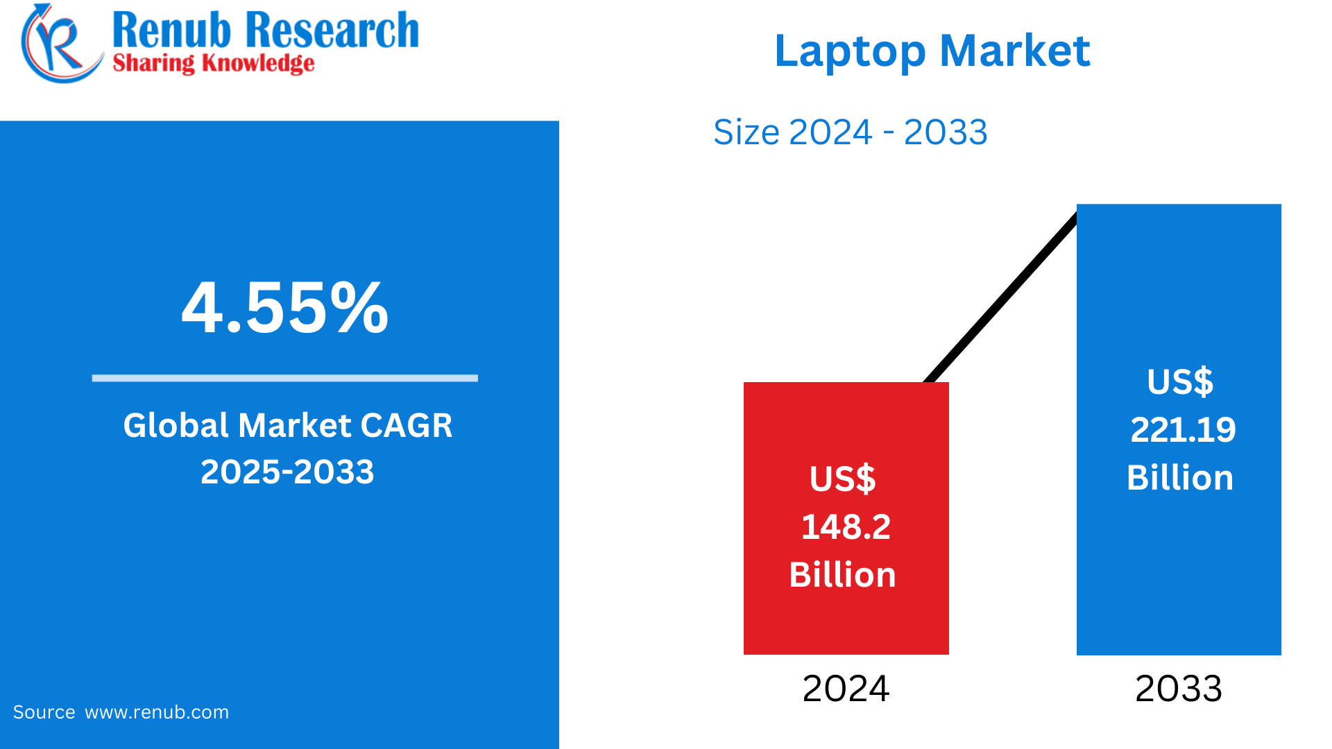 According to Renub Research global laptop market is projected to witness steady growth over the forecast period, supported by rising demand for portable computing solutions and the rapid digitalization of work, education, and entertainment. The market was valued at US$ 148.2 billion in 2024 and is expected to reach US$ 221.19 billion by 2033, growing at a compound annual growth rate (CAGR) of 4.55% from 2025 to 2033. Key factors driving this growth include the increasing preference for mobility, the expansion of remote and hybrid work models, the fast-growing education sector, technological advancements, and the rising culture of digital nomads.
