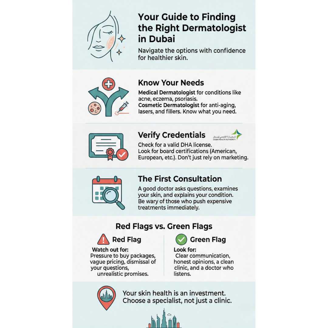 The right dermatologist for you is the one who specializes in your specific concern, communicates clearly, avoids pushing unnecessary treatments, and has verifiable credentials from a recognized medical board. That sounds simple, but in a city like Dubai where hundreds of clinics compete for attention with flashy marketing, finding someone who genuinely fits your needs takes a bit more effort than just picking the first name on Google.
