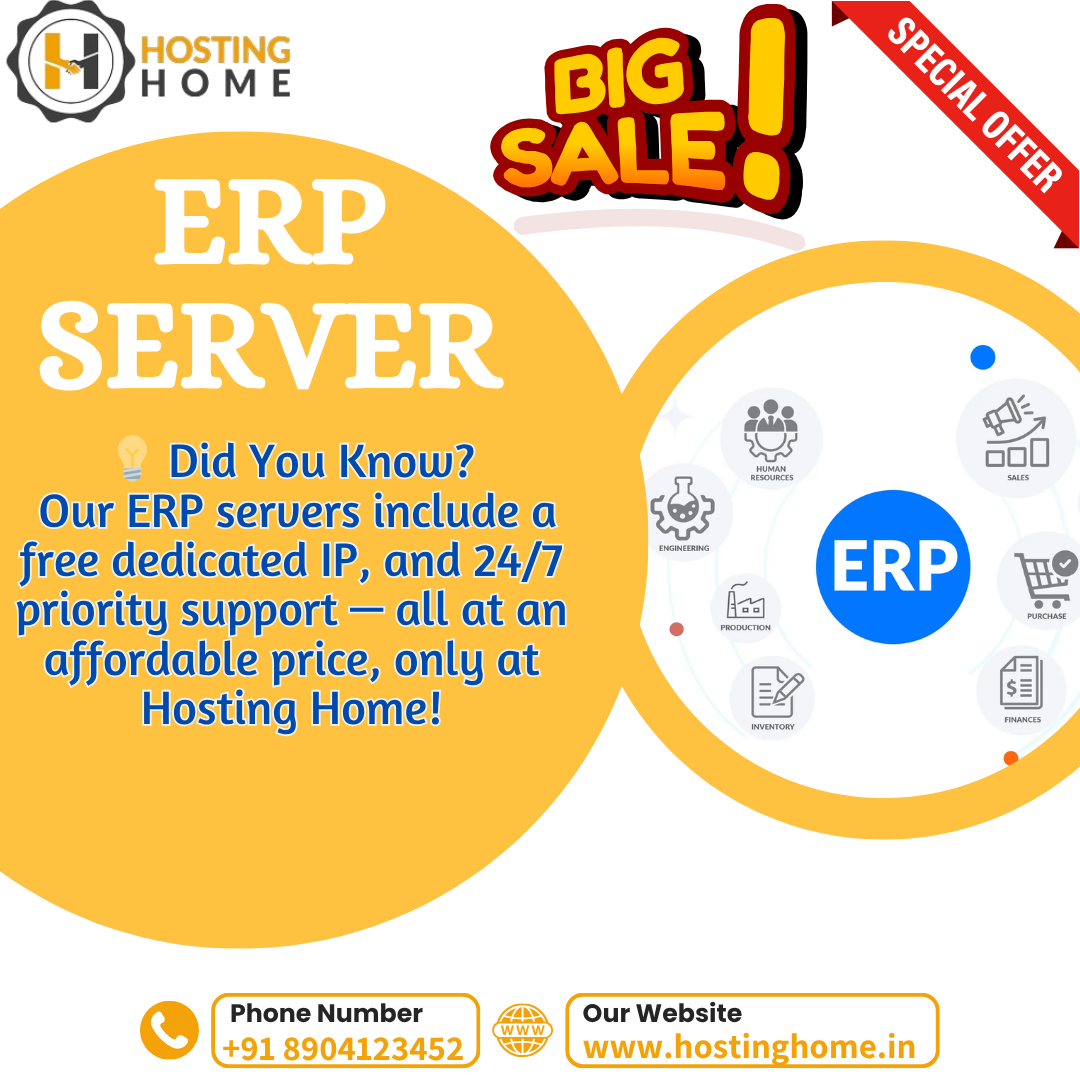 Get affordable and reliable ERP server hosting with Hosting Home. Our ERP hosting solution includes free migration, dedicated IP, SSL for all domains, and 24/7 high-priority support. Enjoy the benefits of DDoS protection, high-speed NVMe storage, and a stable platform tailored for efficient business operations. Partner with us to give your enterprise processes a powerful boost at just ₹1399/month.